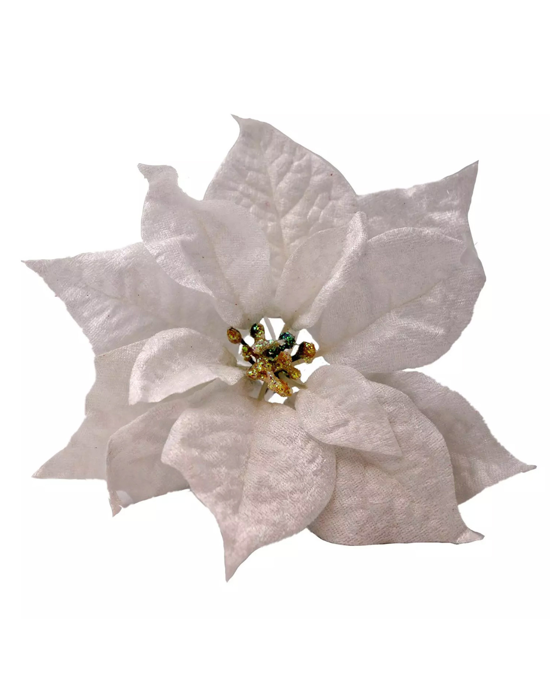 Sæt med 12 hvide Poinsettia blomster med klemme – perfekt til juletræspynt og elegante indendørs dekorationer. Naturtro design med glitterfinish. Mål pr. blomst: H 17 cm x L 23 cm x B 23 cm.