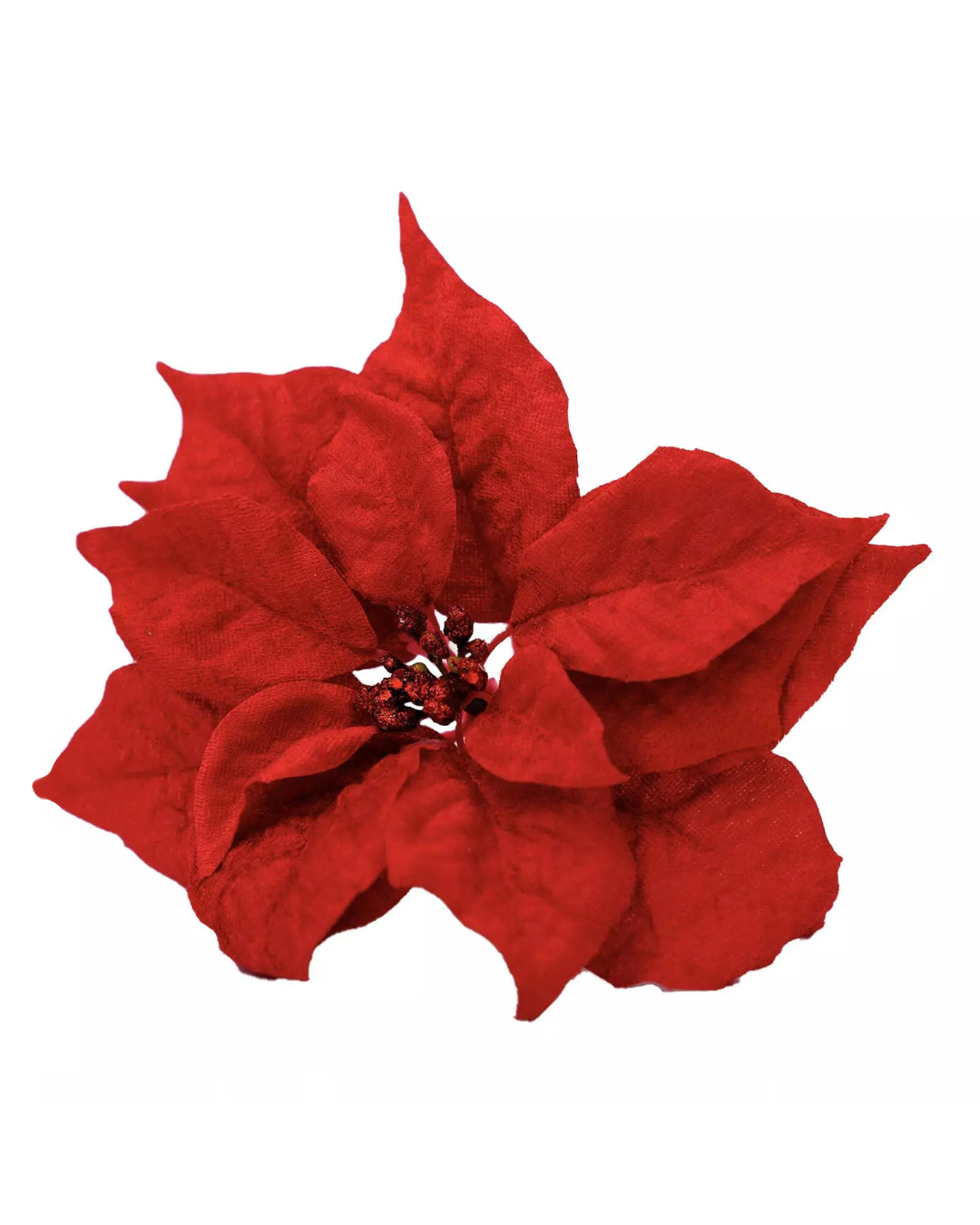 Sæt med 12 Poinsettia blomster i rød med klemme – perfekt til juletræspynt og elegante indendørs dekorationer. Naturtro design med glitterfinish. Mål pr. blomst: H 17 cm x L 23 cm x B 23 cm.