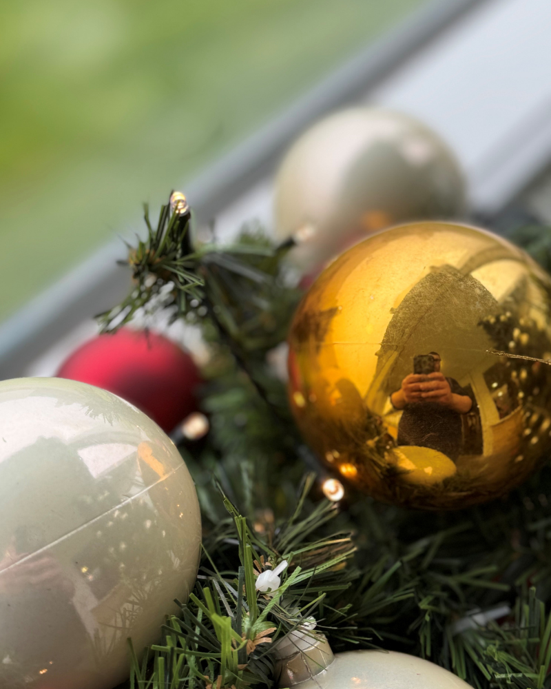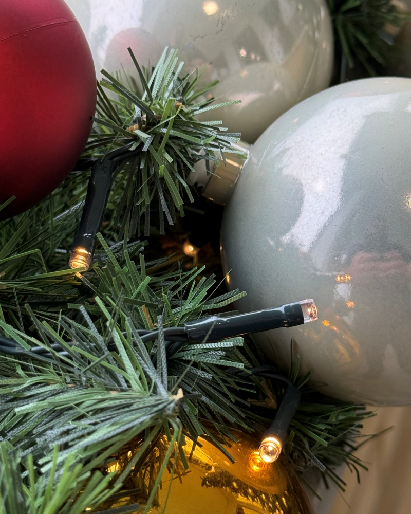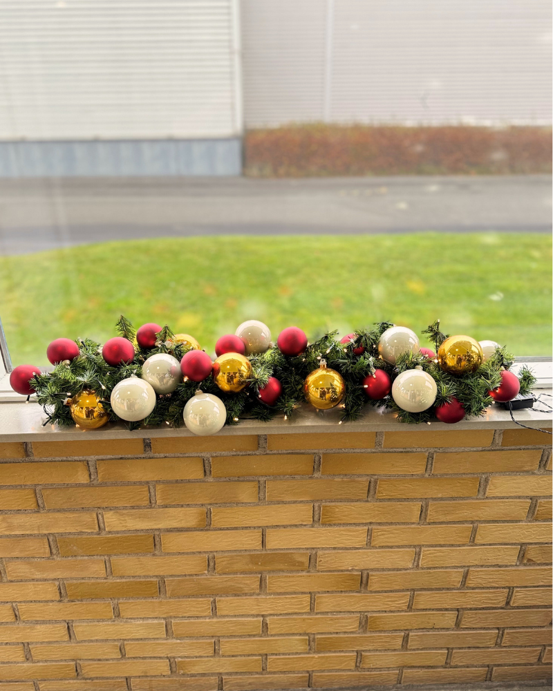Materiale: Kunstigt gran dekoreret med julekugler med 15 stk. Ø60 og 17 stk. Ø80 samt batterilyskæde.