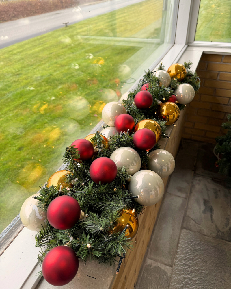 Demo granguirlande med 32 assorterede kugler (rød, perlemor, guld) og batterilyskæde.