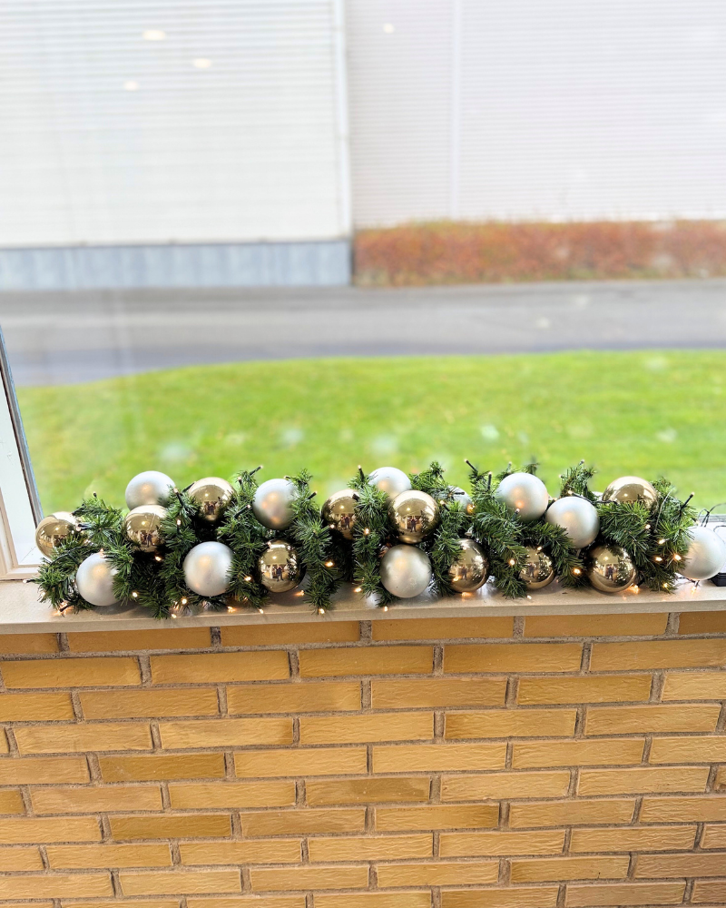 Demo granguirlande med 28 assorterede kugler (guld, sølv) og batterilyskæde.