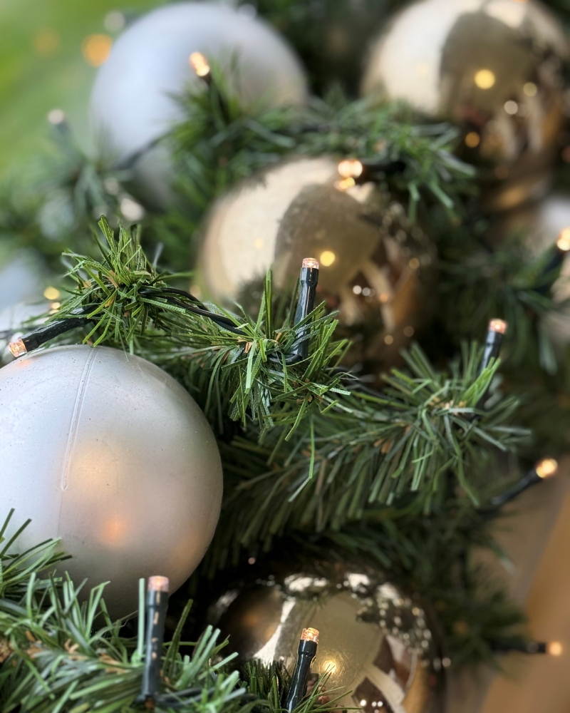 Det naturtro kunstige gran er udsmykket med kugler i guld og sølv samt en varm hvid LED-lyskæde med 8 funktioner og memory.