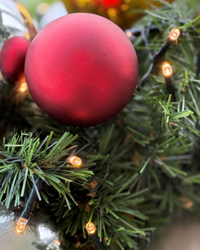 Det naturtro gran er pyntet med kugler i rød, sølv og guld samt en varm hvid LED-lyskæde med 8 funktioner.