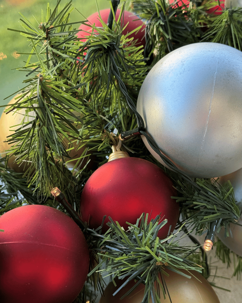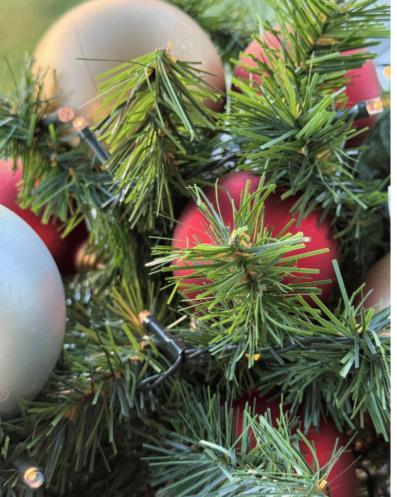 Materiale: Kunstigt gran dekoreret med julekugler med 14 stk. i Ø60 og 20 stk. i Ø80 samt batterilyskæde.