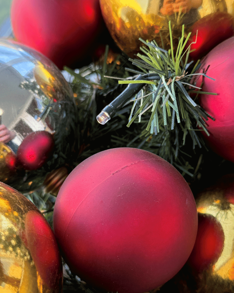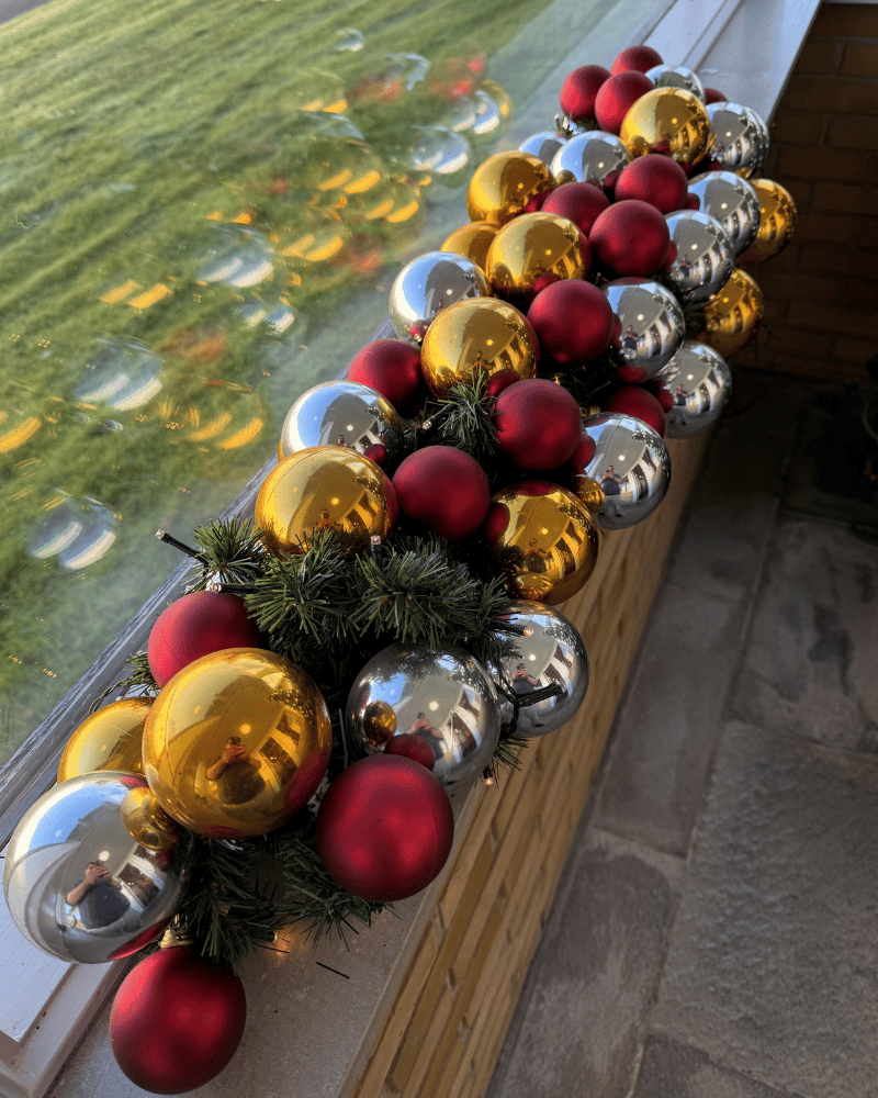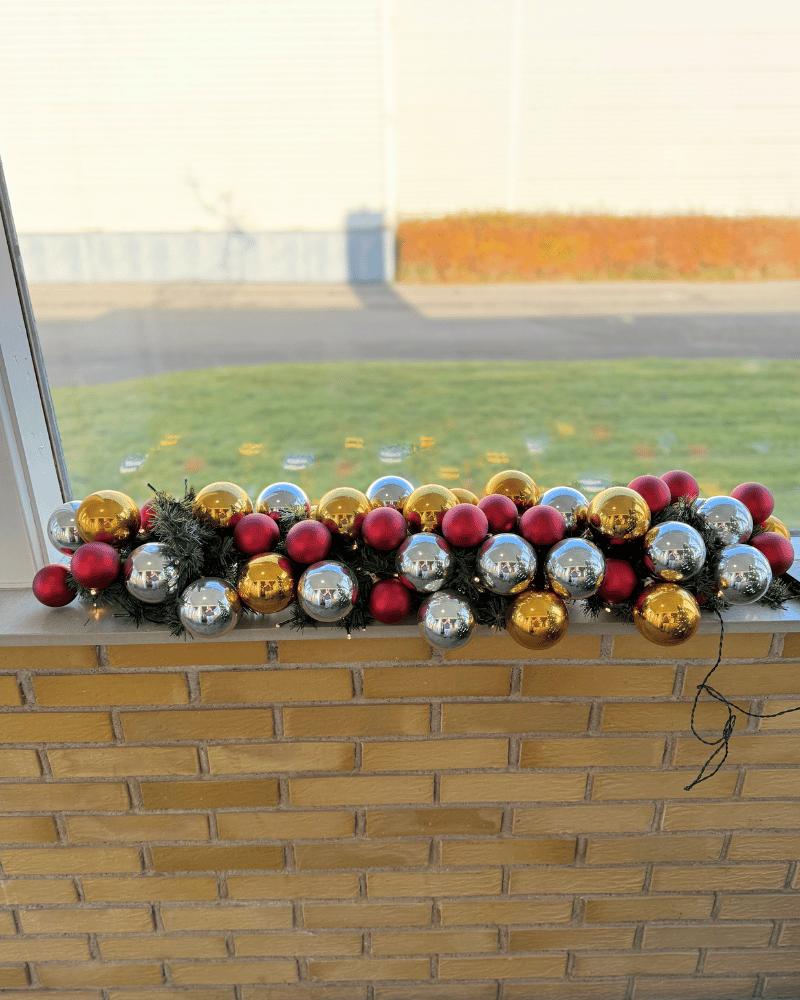 Demo granguirlande med 49 assorterede kugler (guld, rød, sølv) og batterilyskæde.