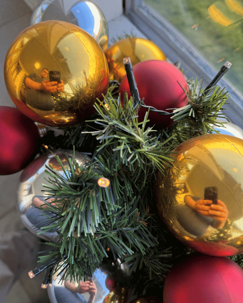Materiale: Kunstigt gran dekoreret med julekugler med 17 stk. i Ø60 og 32 stk. i Ø80 samt batterilyskæde.