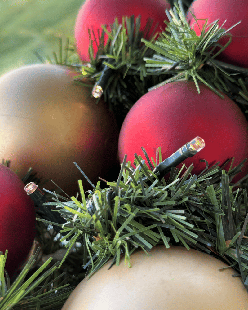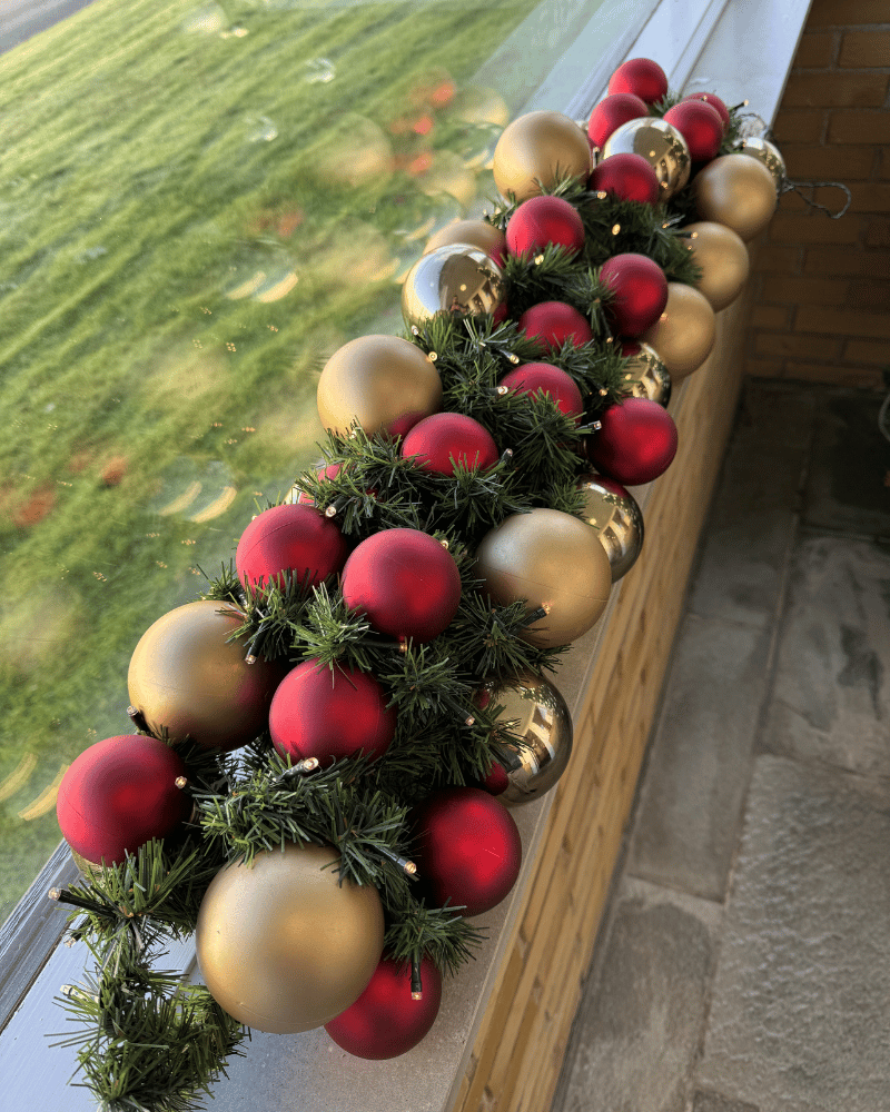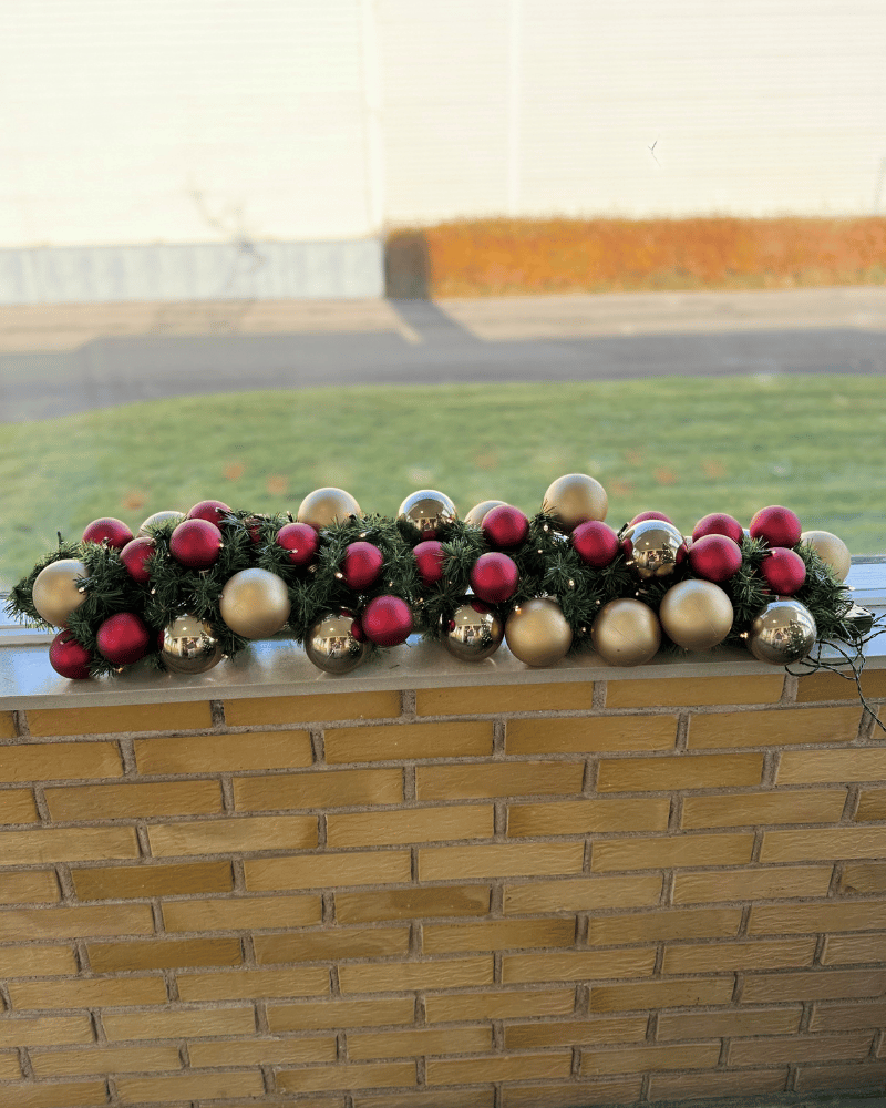 Demo granguirlande med 43 assorterede kugler (rød, champagne) og batterilyskæde.