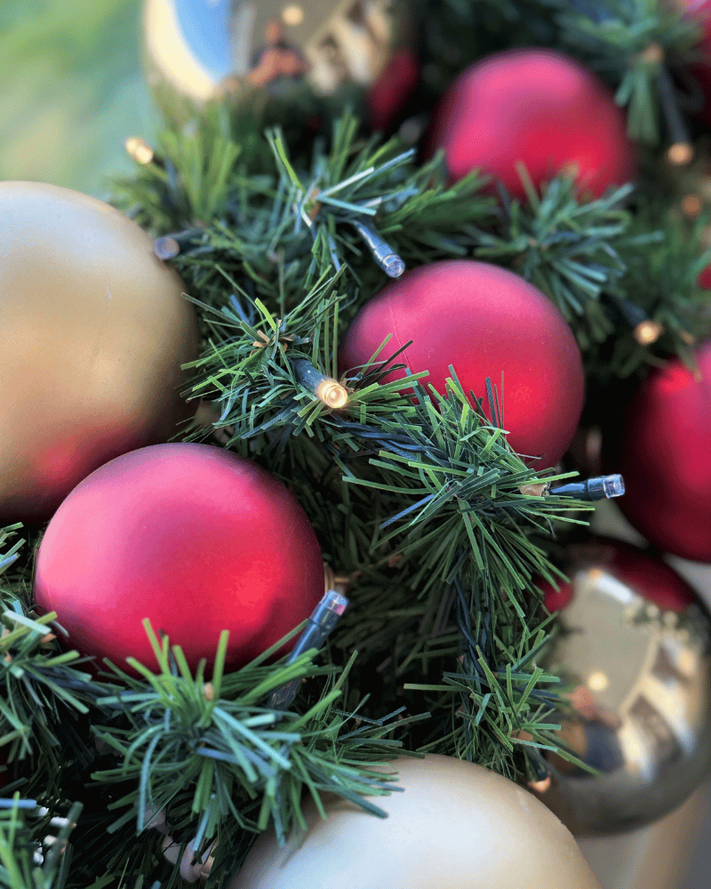 Materiale: Kunstigt gran dekoreret med julekugler med 19 stk. i Ø60 og 24 stk. i Ø80 samt batterilyskæde.