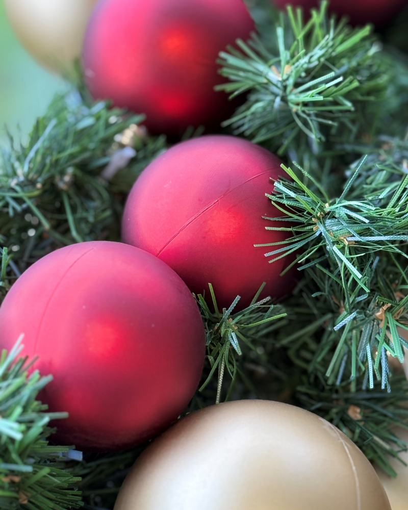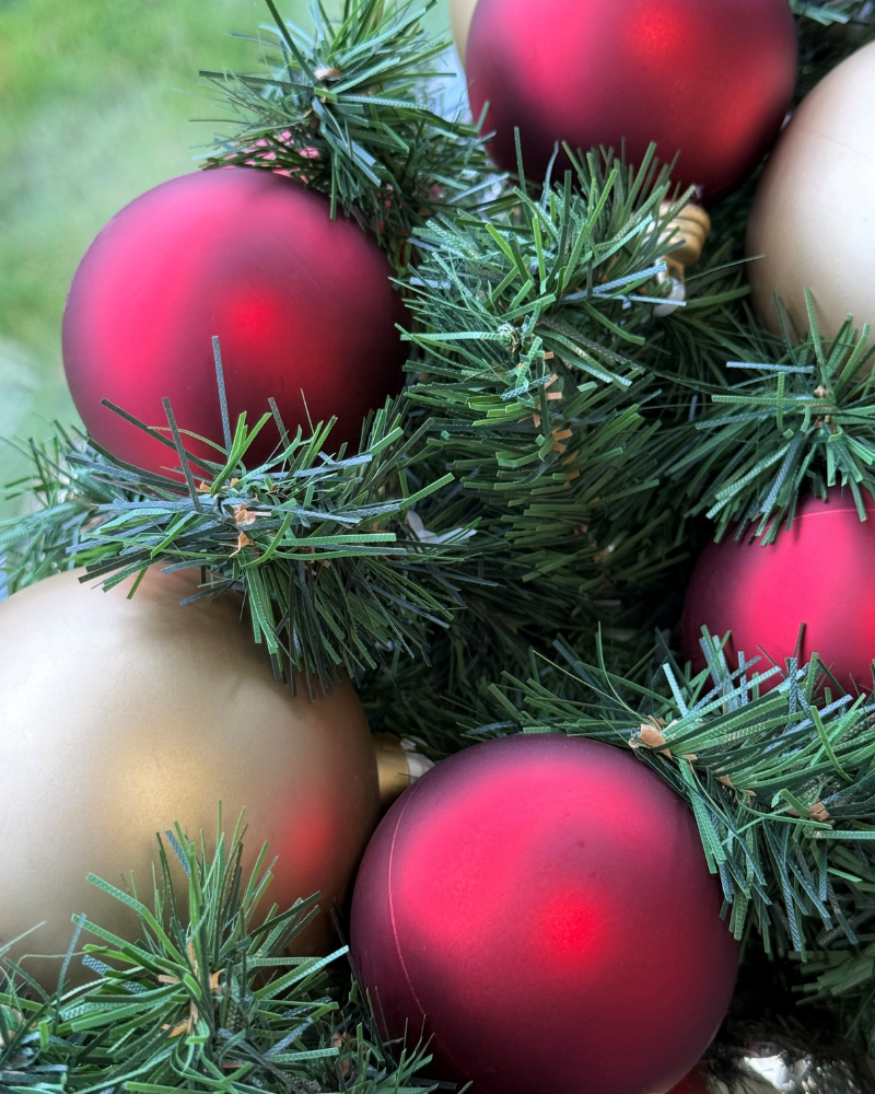 Det naturtro gran er dekoreret med julekugler i rød og champagne, hvilket giver et stilrent og harmonisk udtryk.