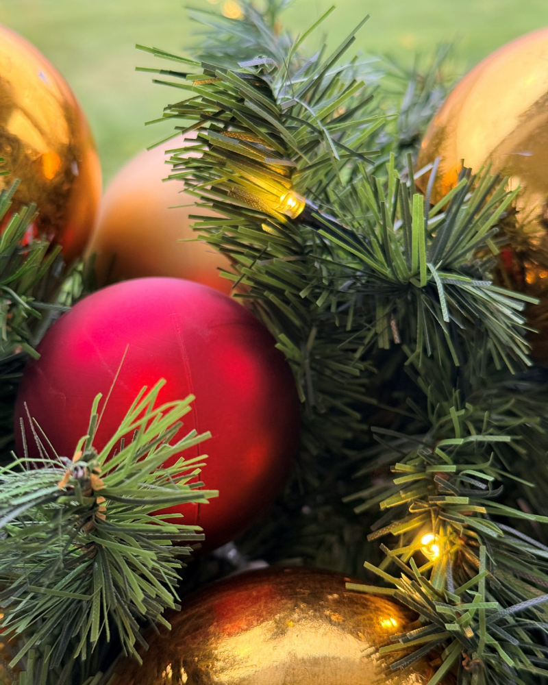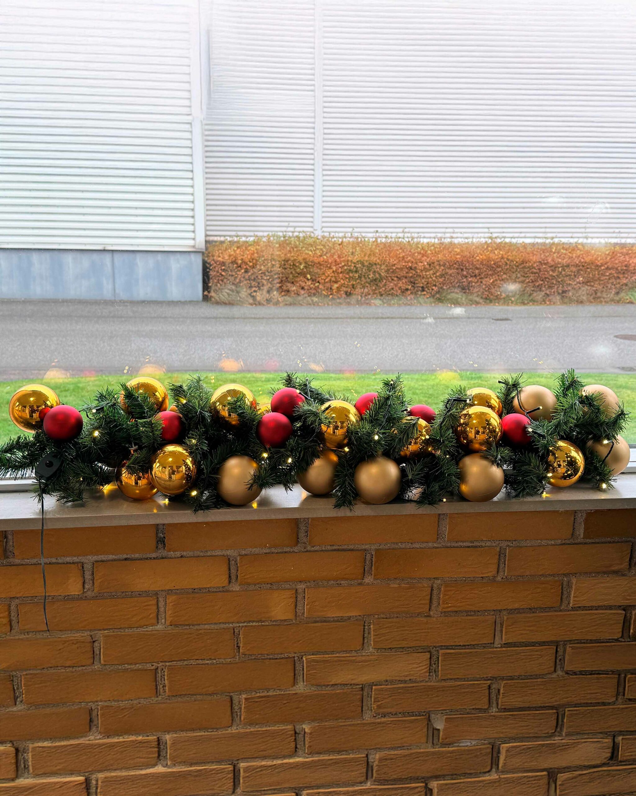 Materiale: Kunstigt gran dekoreret med julekugler med 10 stk. i Ø60 og 24 stk. i Ø80 samt LED-lyskæde.