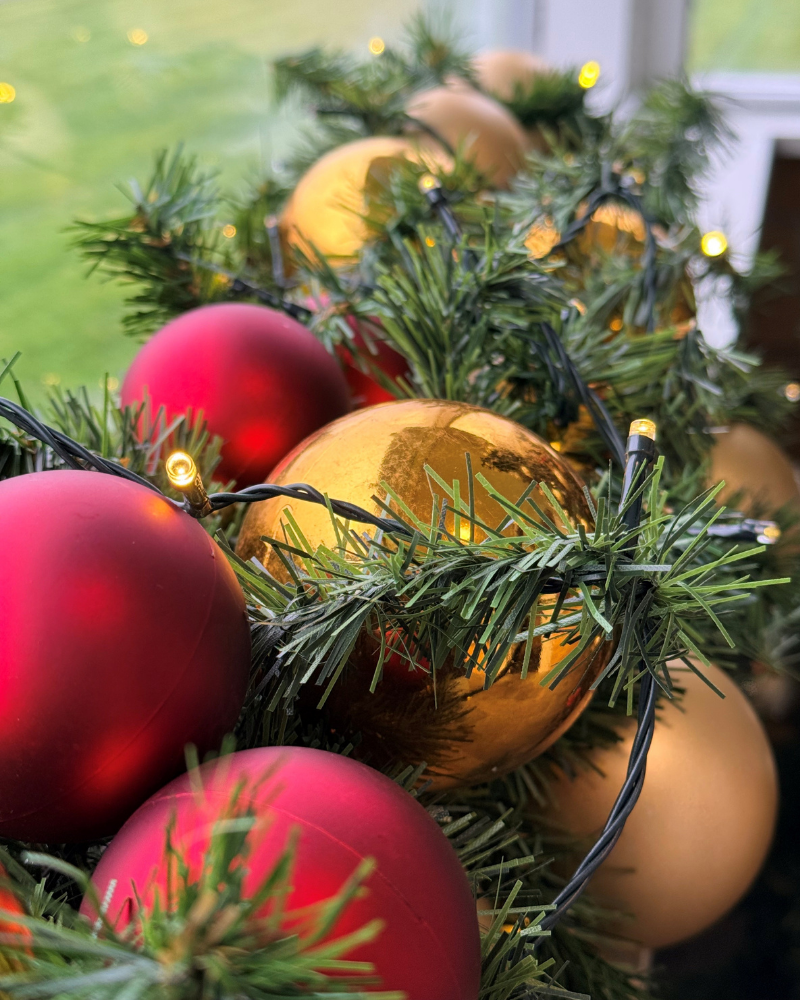 Demo granguirlande med 34 assorterede julekugler (rød, guld, champagne) og LED-lyskæde med alm. strømforsyning.