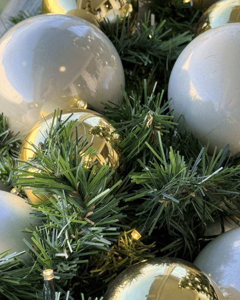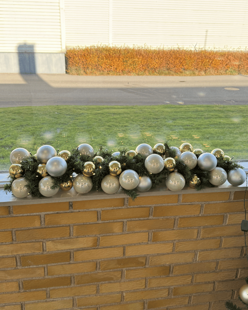 Det naturtro gran er udsmykket med 44 julekugler i guld, sølv og hvid samt en varm hvid LED-lyskæde med 16 lyseffekter. Guirlanden kan let forlænges med ståltråd for et elegant og sammenhængende udtryk.