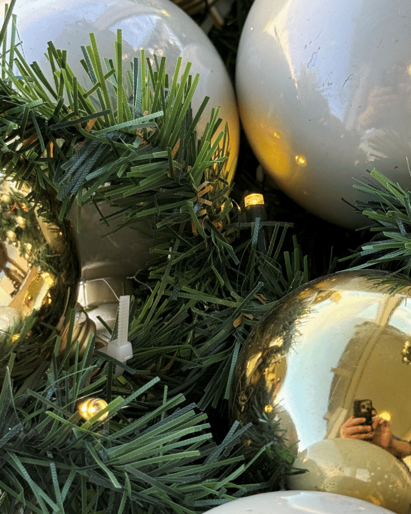 Demo granguirlande med 44 assorterede kugler (sølv, guld, perlemor) og LED-lyskæde med alm. strømforsyning.