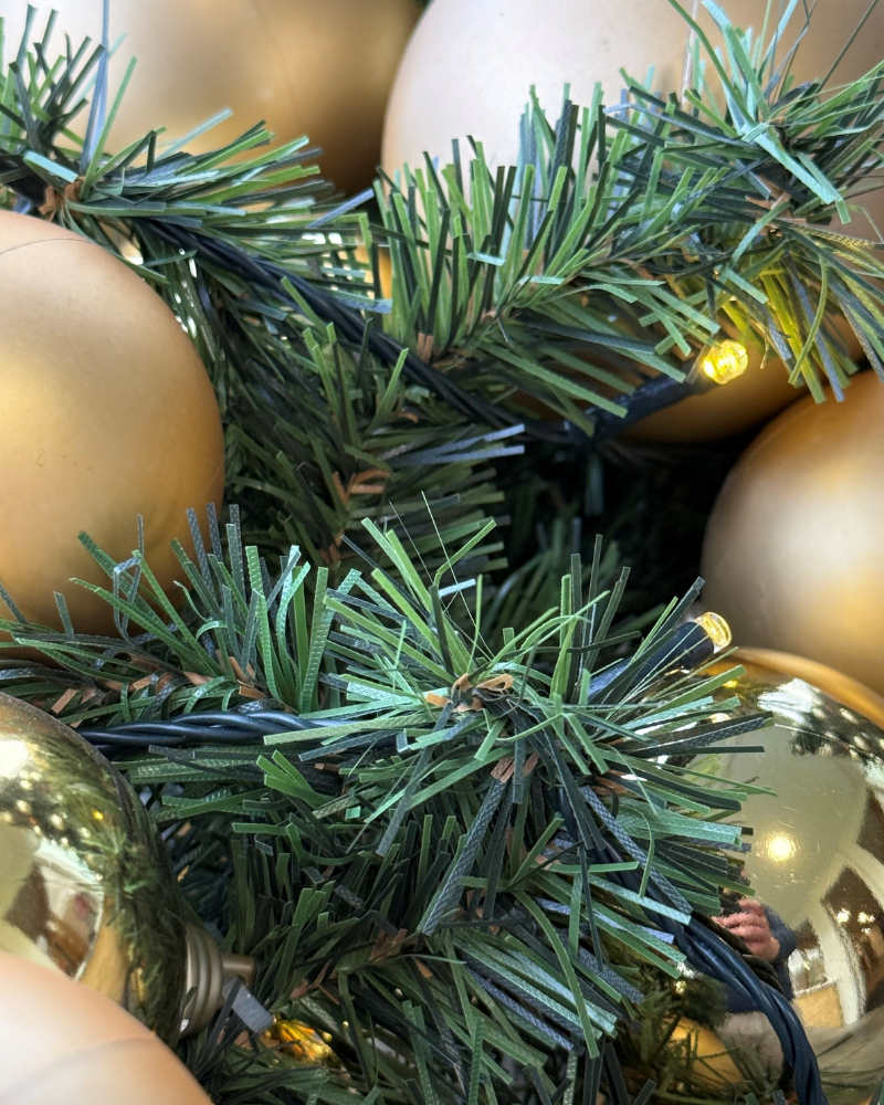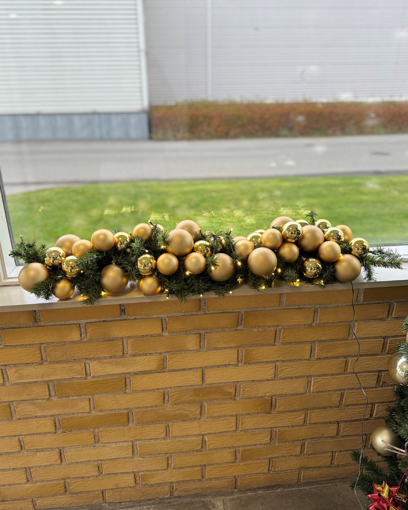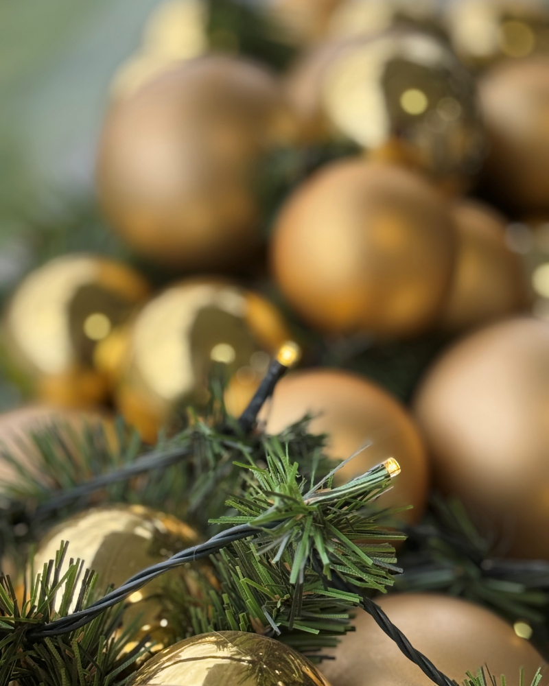 Demo granguirlande med 46 assorterede julekugler (guld, champagne) og LED-lyskæde med alm. strømforsyning.