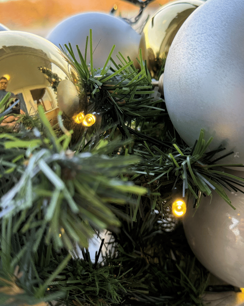 Materiale: Kunstigt gran dekoreret med julekugler med 15 stk. i Ø60 og 20 stk. i Ø80 samt LED-lyskæde.