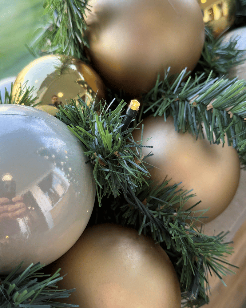 Materiale: Kunstigt gran dekoreret med julekugler med 7 stk. i Ø60 og 28 stk. i Ø80 samt LED-lyskæde.