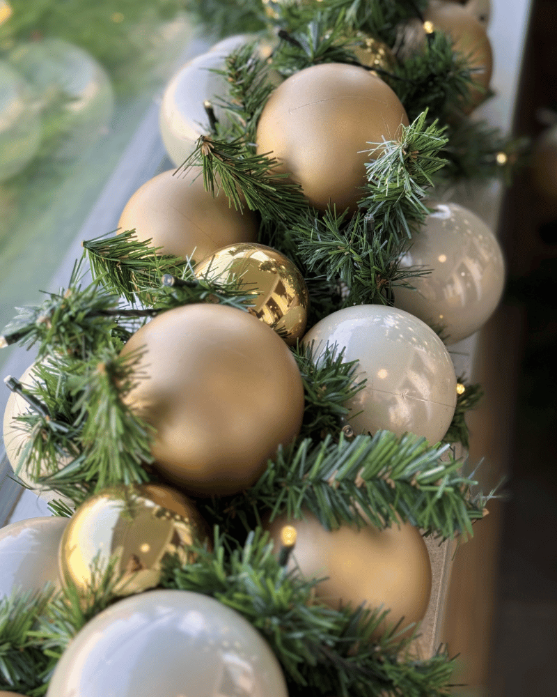 Demo granguirlande med 35 assorterede julekuglerkugler (guld, champagne, perlemor) og LED-lyskæde med alm. strømforsyning.