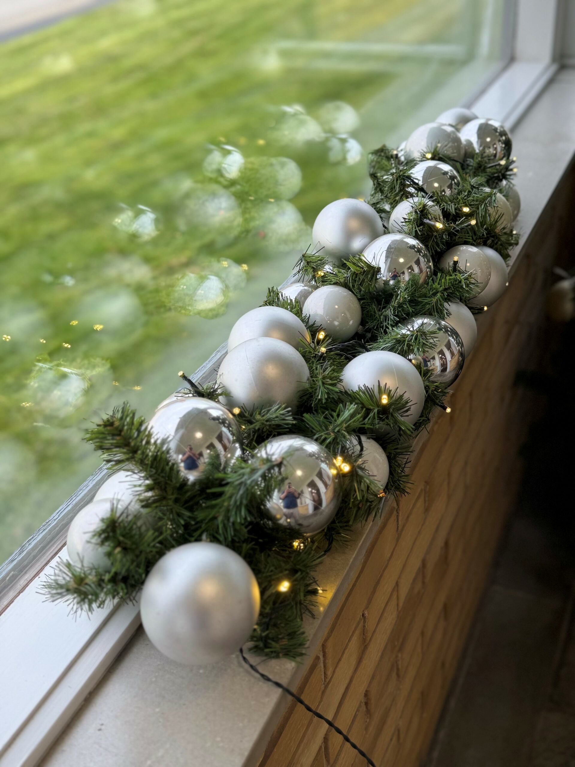 Demo granguirlande med 29 assorterede julekugler (sølv, perlemor) og LED-lyskæde med alm. strømforsyning.