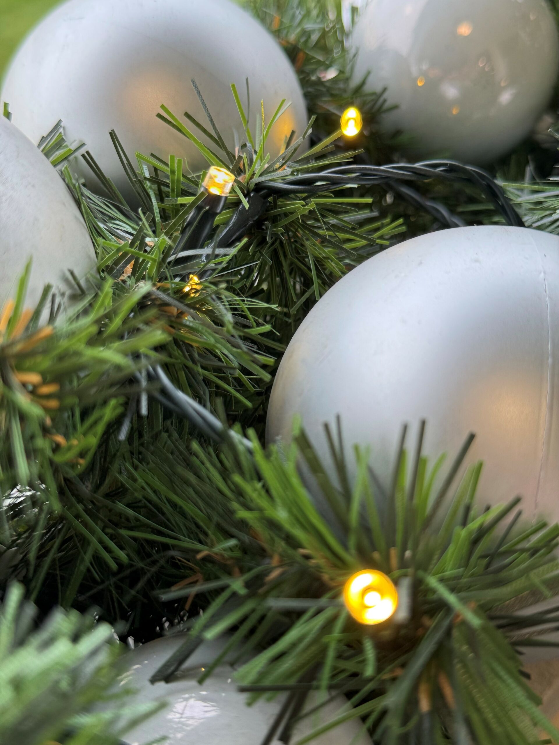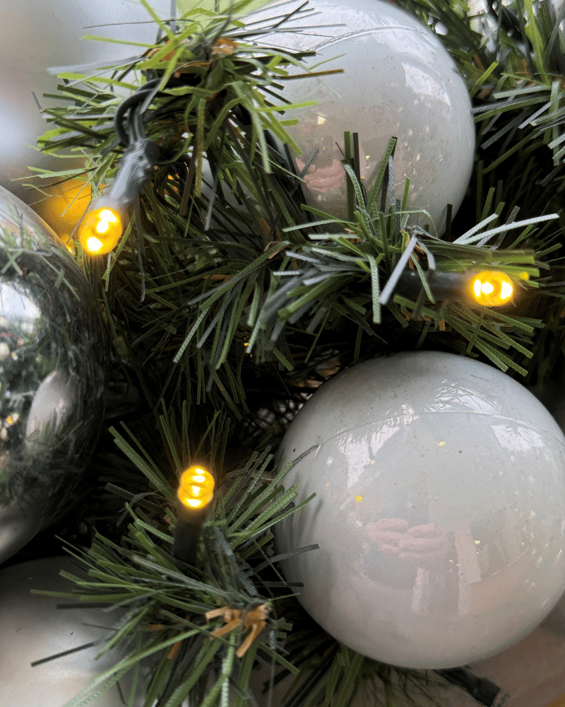 Det naturtro gran er pyntet med sølv- og hvide julekugler samt en varm hvid LED-lyskæde med 16 lyseffekter.