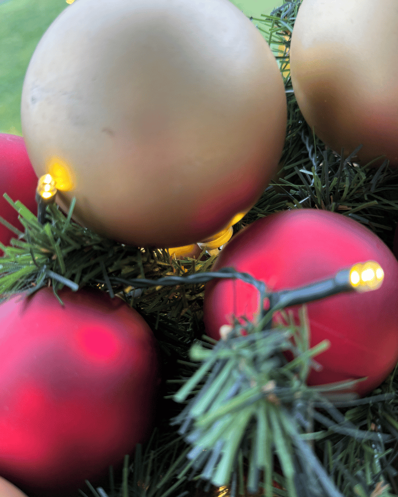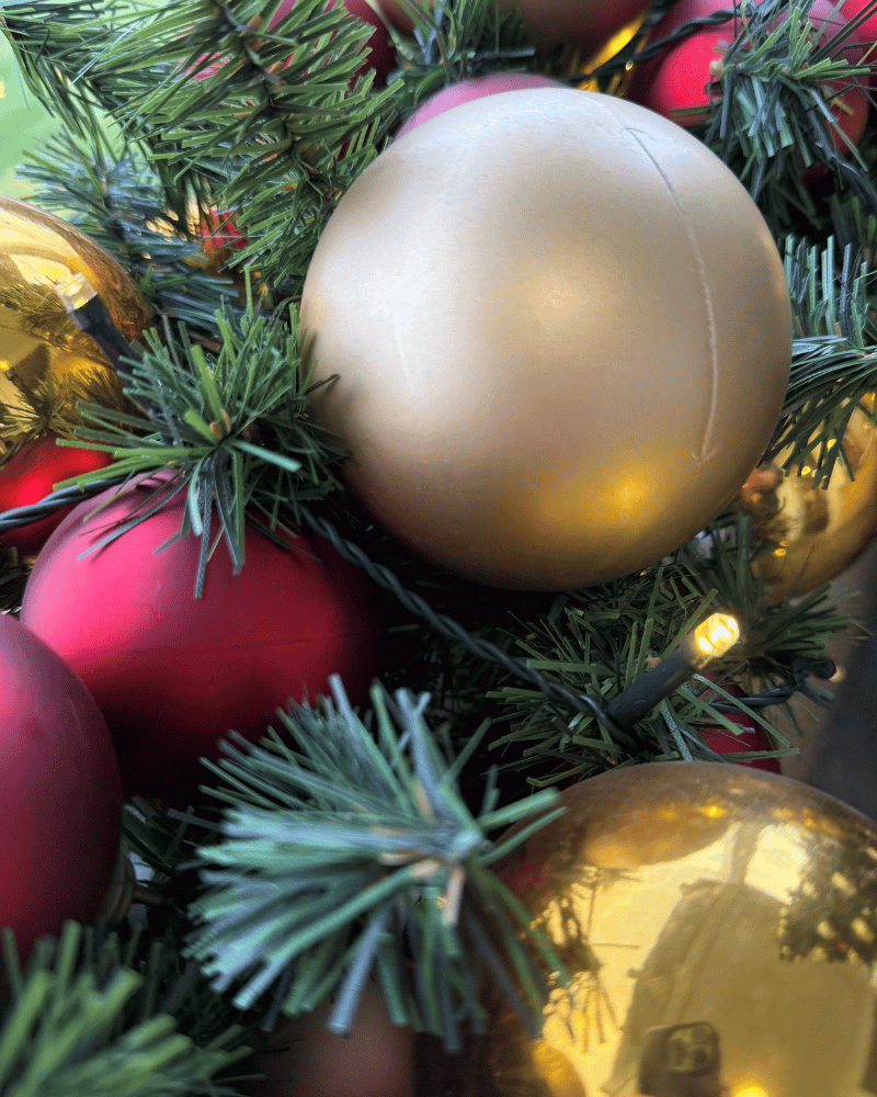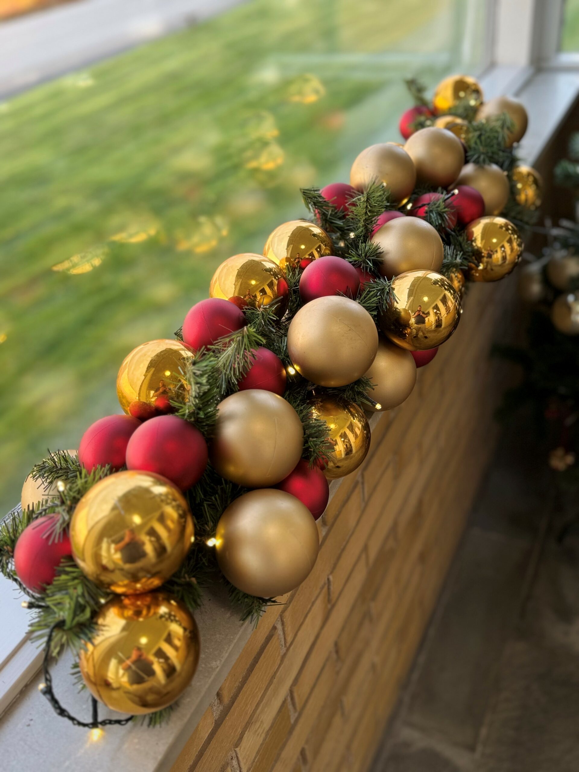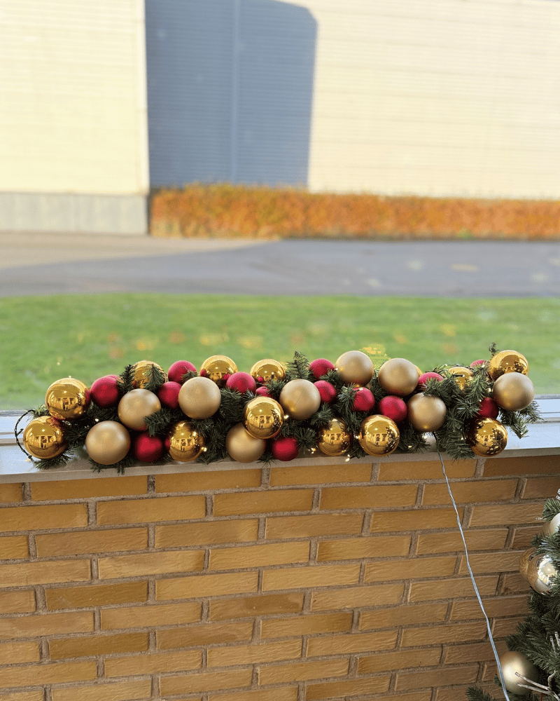 Demo granguirlande med 47 assorterede julekugler (rød, guld, champagne) og LED-lyskæde med alm. strømforsyning.