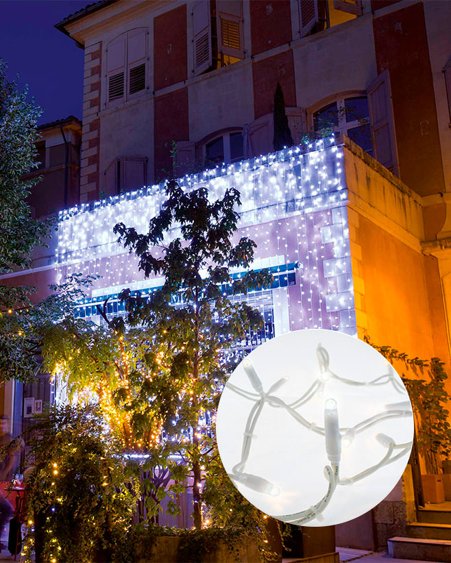 Joylight lysgardin med hvidt kabel – til private og professionelle vinterudsmykninger.