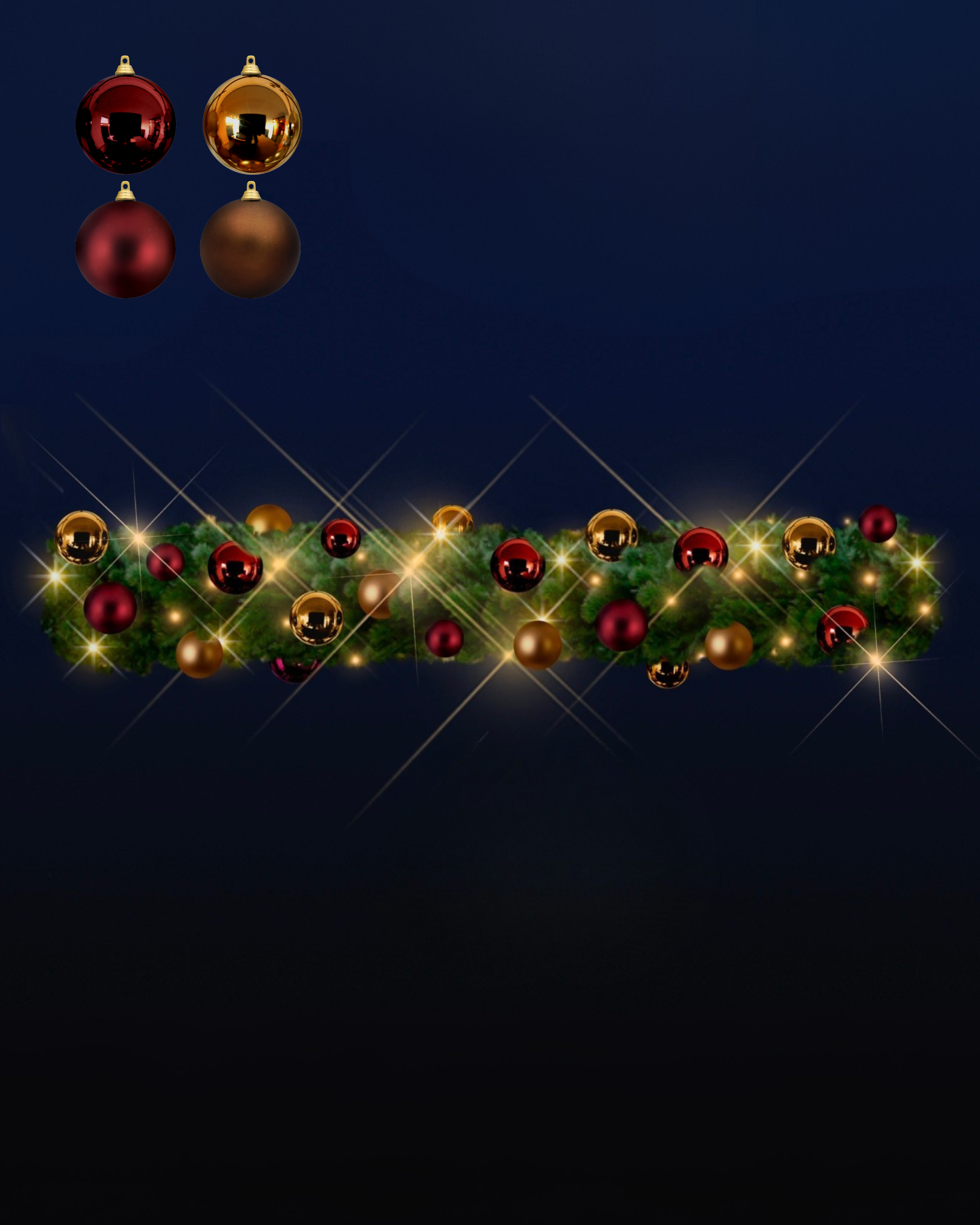 Færdigsammensat dekorationskit med brandhæmmende julekugler i dyb bordeaux og varm mokka. Skaber et elegant og harmonisk udtryk i guirlander – klar til montering.