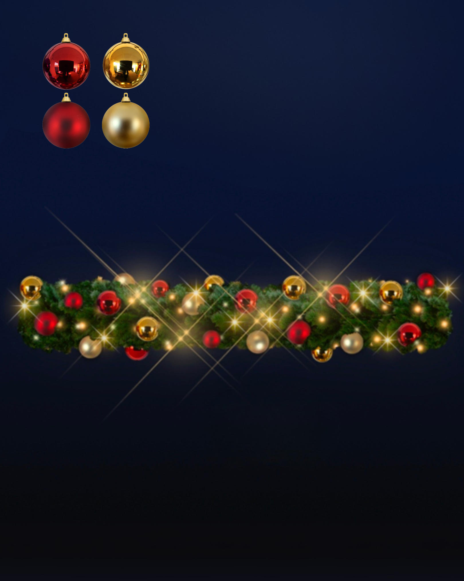 Færdigsammensat dekorationskit med brandhæmmende julekugler i klassisk rød og guld. Perfekt til at skabe et fyldigt og harmonisk udtryk i guirlander – klar til montering.