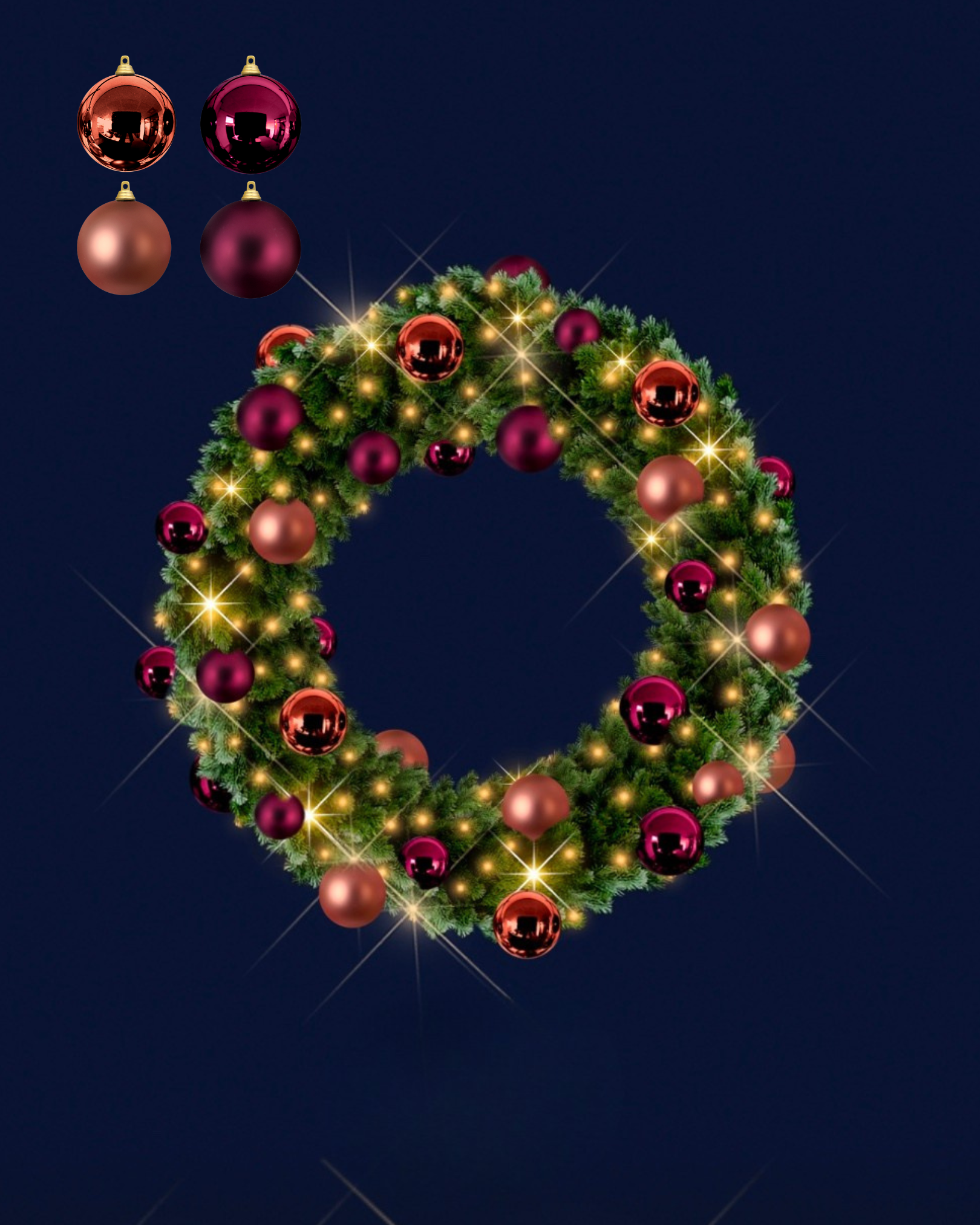 Færdigsammensat dekorationskit med brandhæmmende julekugler i pudderrosa og varm rød. Skaber et blødt og elegant udtryk – perfekt til professionel juleudsmykning af kranse.
