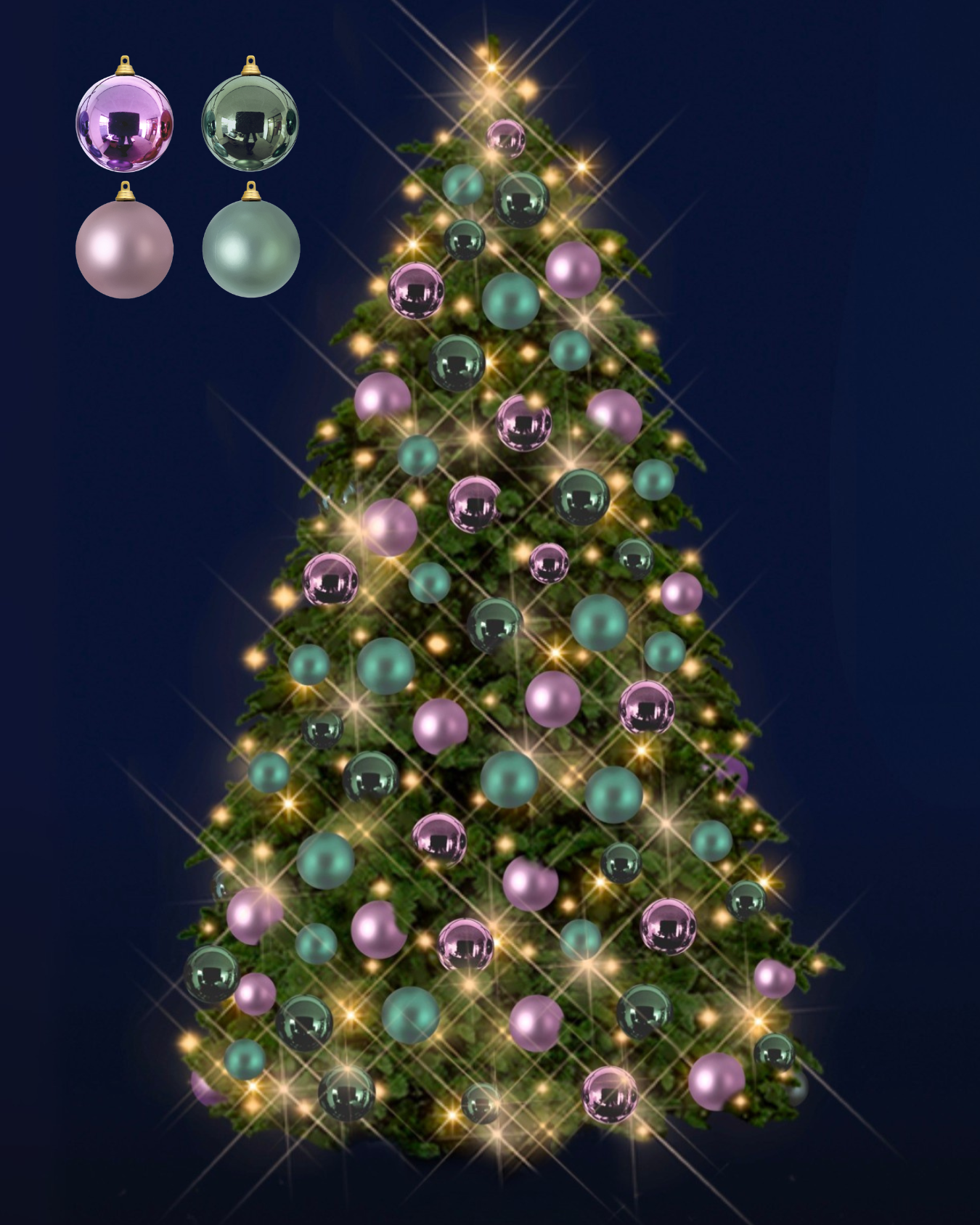 Stort juletræ (365-425 cm): 140 kugler (8 cm) + 96 kugler (10 cm) + 44 kugler (15 cm)