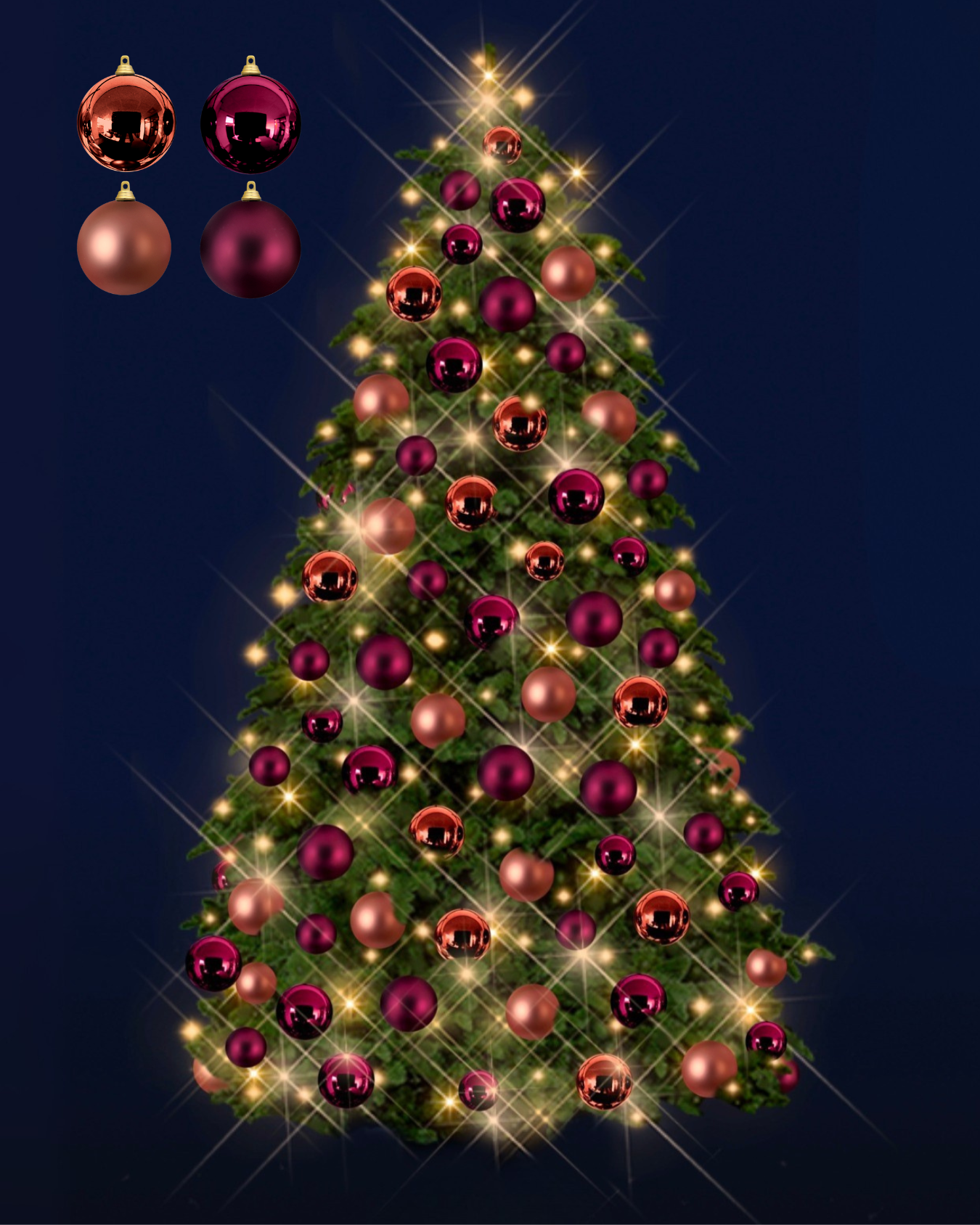 Kittet indeholder brandhæmmende julekugler i to farver og to finish-typer (mat og glans), og er tilpasset træets størrelse, så du opnår et fyldigt og harmonisk resultat. Alle kugler leveres med limet krone og jerntråd, klar til montering.
