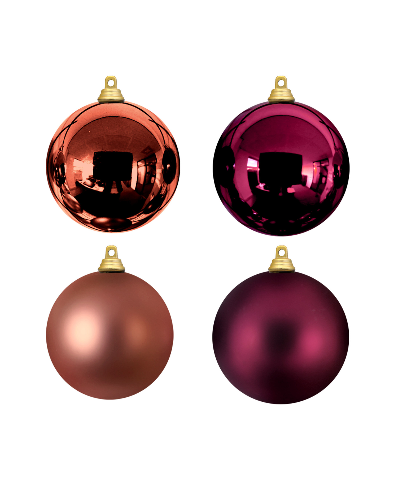 Færdigsammensat dekorationskit med brandhæmmende julekugler i pudderrosa og varm rød. Skaber en blød og stilfuld julestemning – perfekt til professionel juleudsmykning.