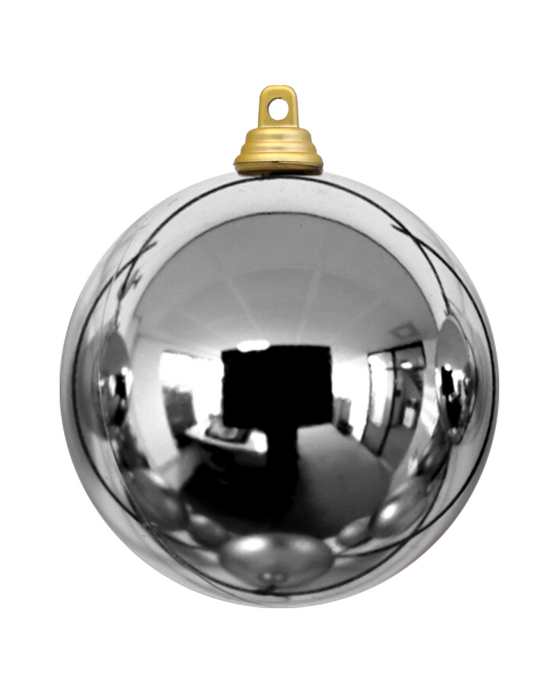 Julekugle fremstillet i holdbart og brandhæmmende plast med skinnende sølvfinish.