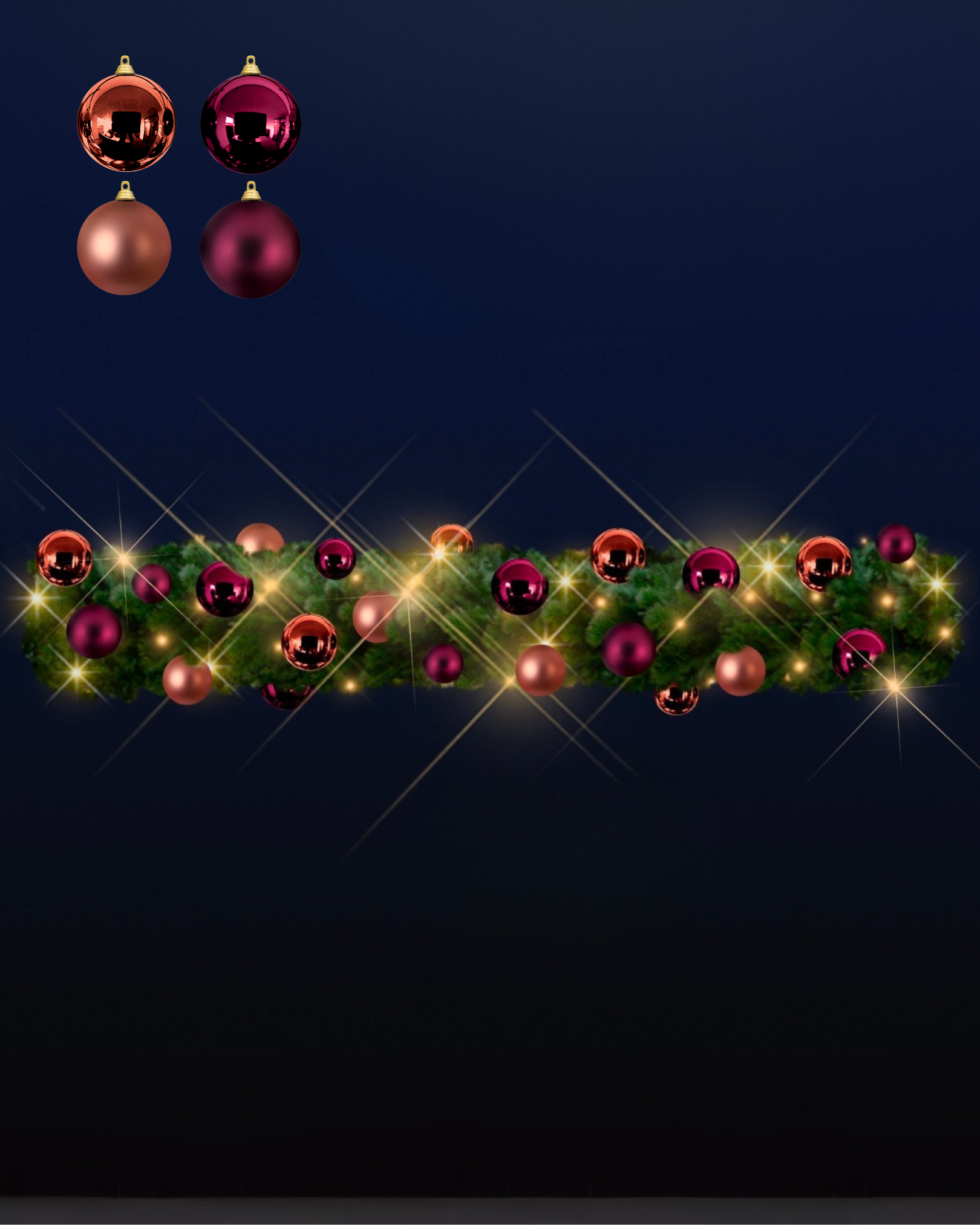 Færdigsammensat dekorationskit med brandhæmmende julekugler i pudderrosa og varm rød. Skaber et blødt og elegant udtryk i guirlander – klar til montering.