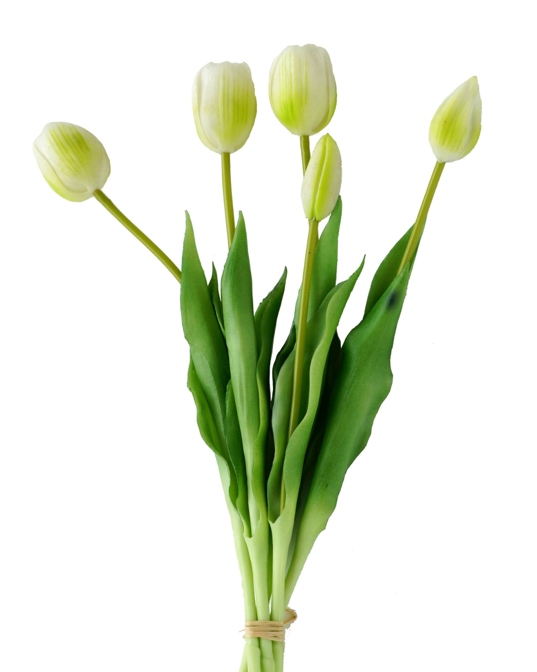 Skab et stilrent og indbydende udtryk med denne hvide tulipanbuket. Buketten er fremstillet i realistiske materialer, der giver et naturligt look uden behov for vanding eller vedligeholdelse.
