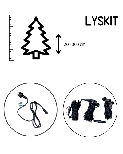 Komplet 230V lyskædekit til juletræ – fra 120 til 300 cm, til indendørs og udendørs brug.
