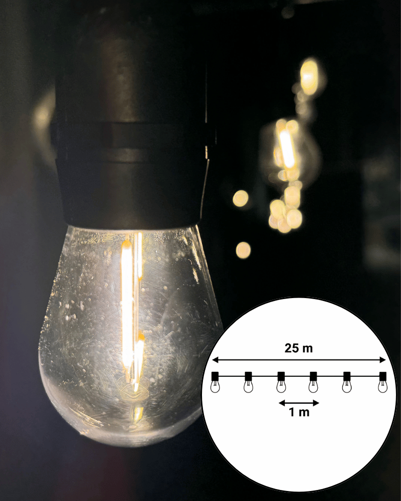 Længde: 25 meter (kan forlænges op til 50 lyskæder – maks. 1000 W samlet belastning).