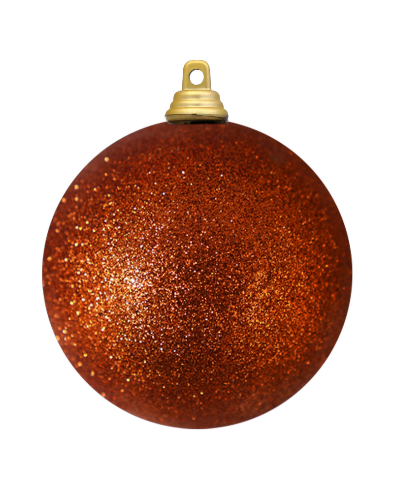 Glitrende kobber julekugler i brandhæmmende plast – eksklusiv glitterfinish med sikker ophængning til inde- og udendørs brug.