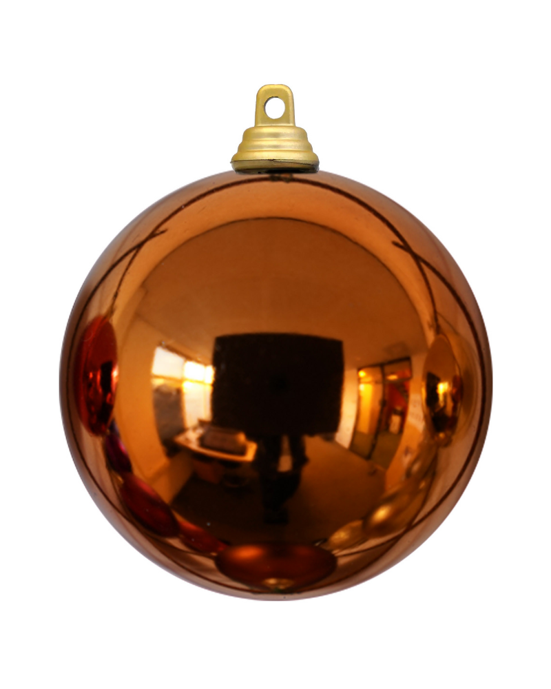 Skinnende kobber julekugler fremstillet i holdbart og brandhæmmende plast.