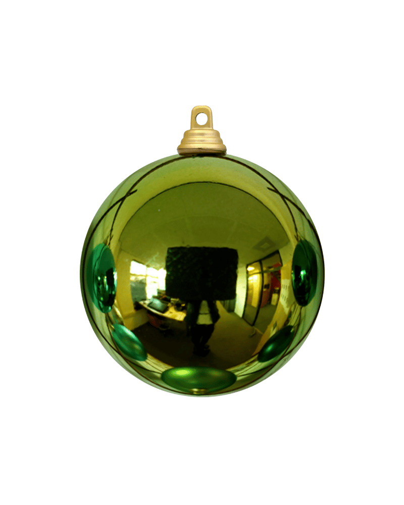 Skinnende lysegrønne julekugler fremstillet i robust og brandhæmmende plast.