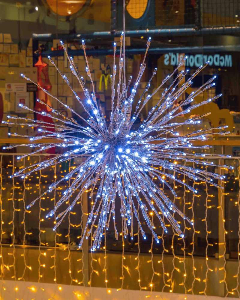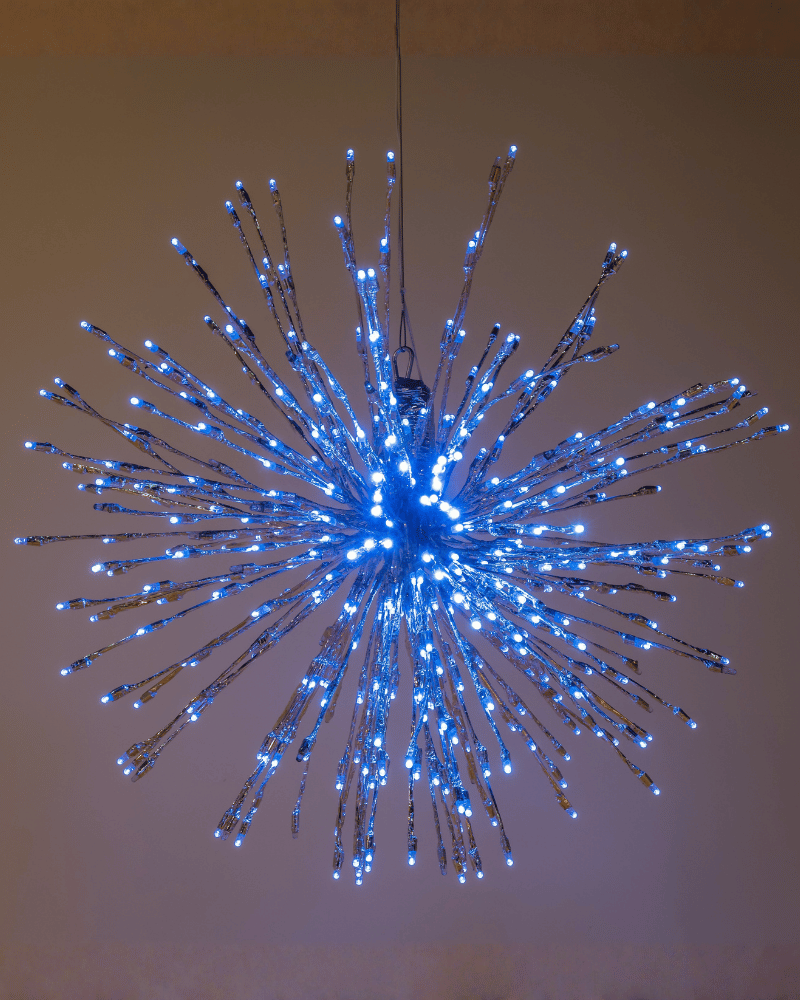 Dette dekorative LED-ophæng er skabt til at imponere med sit elegante og moderne udtryk. Med 441 kolde hvide LED-lys og 63 flash-LED fordelt på 126 grene, leverer det en levende og iøjnefaldende lysoplevelse, der passer perfekt til butiksmiljøer, hoteller, events, showrooms og private hjem med sans for design.